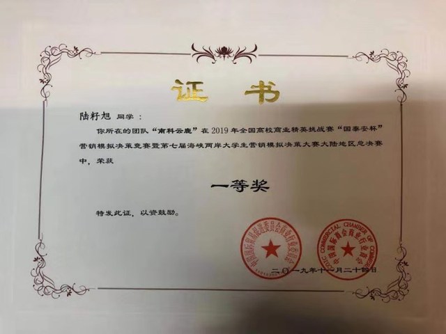 2019年11月24日,由中国国际贸易促进委员会举办的2019年全国高校商业精英赛“国泰安杯”营销模拟决策决赛暨第七届海峡两岸大学生营销模拟决策大赛大陆地区总决赛落下帷幕,我校汽车营销1821宗建、沈新宇等同学组建的“南科北斗”与陆籽旭、罗云等同学组建的“南科云鹿”两个参赛团队同时获得一等奖。
